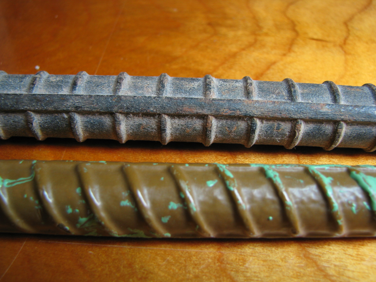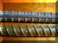 ACI 318-19 20.2.1.1 requires that all bars, except those used in spirals, be "deformed" bars. The deformations referred to are the "bumps" found on reinforcing steel. The presences of these deformations enhances the mechanical bond between the steel and concrete. The Concrete Reinforcing Steel Institute (CRSI) website has lots of valuable resource information about reinforcing steel. Their webstore has a number of references that are quite useful. You should check it out. Also note that each bar, per ASTM specifications, is marked with a symbol from the producing mill, bar size, bar type, and grade. The CRSI website has information about the specifics of the markings at http://www.crsi.org/index.cfm/steel/identification. The two most used mechanical properties for reinforcing steel are the specified yield strength, fy, and the modulus of elasticity, Es. Specified Yield Strength, fy In most cases the steel will have an fy of either 40 ksi or 60 ksi, with 60 ksi being the most common. Higher strengths are available, however, they are typically available only on special order. The "grade" of a bar is the specified yield strength of the bar in ksi. For example, a Grade 60 bar has fy=60 ksi. Modulus of Elasticity, Es ACI 318-19 20.2.2.2 allows Es to be 29,000 ksi. This is consistent with all steels. Types of Rebar ACI 318-19 20.2.1.3 lists the various ASTM steel types that are used for reinforcing bar. Take the time to review the section. Your choice of rebar will be dictated by the demands of your project. ACI 318-19 Table 20.2.2.4(a) will assist you in choosing the right bars for the right applications. Please take some time to review this table. You should also become familiar with what types and grades are commonly available in your area by talking with the local suppliers. Rebar Sizes ACI 318-19 Appendix B has a table of standard rebar sizes in USCU. The table also gives the nominal diameter, nominal area, and weight per foot. Metric standard bar sizes can be readily found using an internet search. The rebar size designator is the number of eighths of an inch closest to the nominal diameter. For example a #3 bar has a nominal diameter of about 3/8", an number #10 bar has a nominal diameter of approximately 10/8". Note that the nominal diameter to be used in design is not always an even eighth of an inch and the nominal area is not necessarily computed from the nominal diameter. Consequently you should use the values as they are listed in the table as opposed to computing diameters and areas numerically from the size designators.