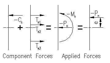 Figure 3.3.1 shows the component forces found by means already discussed and the nominal strengths. This 2D diagram only allows us to compute moment about the centroidal axis perpendicular to the diagram. A similar diagram can be made to depict bending about the orthogonal centroidal axis. Note that the resulting applied forces can always be expressed as a concentric axial force accompanied by moments about the principle axis or as only the axial force acting at an eccentricity, e, that is equal to the moment divided by the concentric force. The force vectors in Figure 3.3.1 are drawn as tension positive. It is important to keep the signs correct on the member forces. The moment vector is drawn as compression at "top" of section positive. Once the forces in the concrete and each of the bars are determined, finding the value of each force/strength is easily found using equilibrium equations. Determining Pn The vectors are drawn in tension positive notation and the moment is shown in positive notation for compressing in the "top" of the section. To find Pn, an equilibrium equation for sum of forces in the axial direction is written: 0 = -Pn + TS1 + ... + TSn + Cc Note that it is very important to maintain the proper signs on the actual values of each component force. Tension values are positive and Compressive values are negative. Determining Mnx and Mny To determine the magnitudes of Mnx and Mny it is necessary to know, for each component force, the magnitude (with appropriate sign) and distance between the centroidal axis in question and each component force. Using the diagram in Figure 3.3.1, we can write an equilibrium equation for moment about the centroidal axis perpendicular to the drawing using the right hand rule. 0 =-Mn - TS1(yS1) - TS2(yS2)