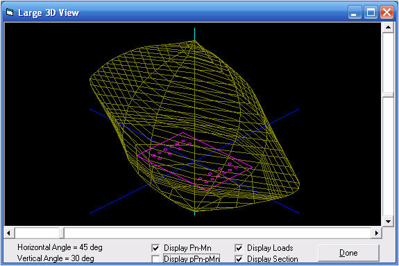 The section shown in this example is most likely to be used as a single axis of bending beam. Consequently, it has only one axis of symmetry. As a result of the lack of symmetry about the X-X axis, the cases for c = 0 and c= very large, have moment associated with them. In a doubly symmetrical member Mnx would equal zero for these two cases. The other special case of interest is pure bending, which occurs when Pn = 0. In this case, c = 5.24" and Mnx = 538 ft-kips. This is the theoretical maximum moment that can be applied in the absence of axial force and the basis for determining the bending capacity of a member acting only as a beam. However, you will also notice that the maximum computed Mnx for this member is 1,077 ft-k. To be able to utilize this moment capacity an compressive axial force of 1,015 k must be applied simultaneously. 3D Interaction Diagrams