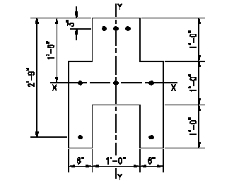 As the location of the neutral axis, c, is varied, different strengths, Pn, Mnx, and Mny are found. Each of the conditions represents an internal force combination which is at the limit of the member strength. If the member is symmetrical (both in shape and reinforcing) about the centroidal axis perpendicular to the neutral axis (a very common condition) then we can make a two dimensional interaction curve. The interaction curve represents all the possible failure combinations for the member when bent around the axis which is perpendicular to the axis of symmetry. Figure 3.4.1 shows the section used in Example Problem #1. In this case, we are considering bending about the X-X axis. You will want to take a close look at this problem. A spreadsheet has been developed to solve this problem for any location, c, of the neutral axis (the neutral axis being parallel to axis X-X). Using the spreadsheet, enough values of Pn and Mnx were determined (Table 3.4.1) to plot a curve (Figure 3.4.2). Note that the computations used tension positive notations however most published interaction diagrams are for sections used primarily as compression members (columns) so compression is positive. For graphing purposes only, the negative compression values are plotted on the positive side of the scale.