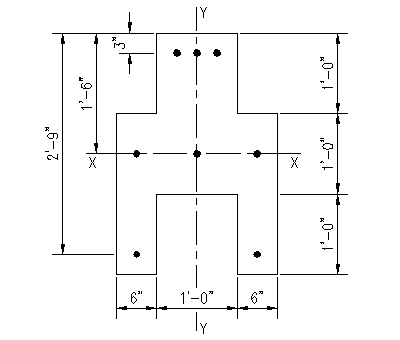 Given: The section shown is Figure 3.6.1.1 is made from concrete with f'c = 5,000 psi. The reinforcing steel consists of #9 bars made from ASTM A615 Gr. 60 rebar. The neutral axis to be oriented parallel to the X-X principle axis. Wanted: