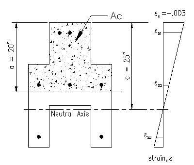 The stress acting on the concrete compression area is: fc = -0.85*f'c = -0.85*(5 ksi) The distribution of this stress, combined with the steel stress, is depicted in Figure 3.6.1.4. Note that the concrete stress is substantially less than the steel stress, however, it is applied over a much larger area. The resultant concrete force is: Cc = fc * Ac Now that all the forces and their locations have been determined we can solve the equilibrium equations to determine the nominal strengths associated with the chosen neutral axis location.