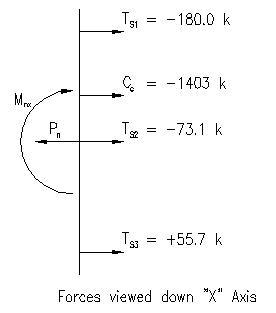 Refer to Figure 3.6.1.5 for the forces used to compute Pn and Mnx. Tension positive notation is used with all the vectors being shown in their positive (tensile) direction as acting on the section face. To find Pn, the nominal axial force located at the section centroid, the sum of forces equilibrium equation is written using tension positive notation as: 0 = -Pn +Cc + TS1 + TS2 + TS3 Next, we determine Mnx, the moment about the "X" axis. This is done by computing moment equilibrium about the "X" axis using right hand rule moment notation. 0 = -Mnx - TS1*|18"-3"| - TS2*|18"-18"|