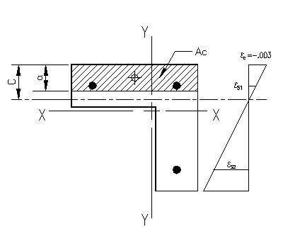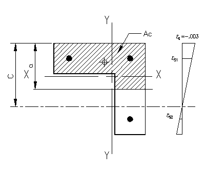The computations for c=25" are essentially the same as in part (b) of the problem, with the exception that the concrete area is no longer a rectangle. Figure 3.6.2.3 shows the compression area and strain diagram for the problem. The solution follows the same basic steps: