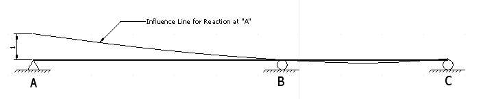 Figure 2: Influence Line for Reaction at "A" The quantitative value of the influence line at “A” is 1.00. What this says is that if a point load is placed on the beam at point “A” the reaction at “A” due to that load would equal the magnitude of that load (value of the influence line at the location of the load times the magnitude of the load). For example, if a 5 kip point load is placed on the beam at “A”, the reaction at “A” due to that load would be 5 kips. If the 5 kip load was moved to point “B” where the value of the influence line is zero, the reaction at “A” due to a 5 kip load at “B” would be 0*5 kips which equals zero. The same would be true if the point load were to be placed at point “C”. As the complete quantitative influence line has not been determined, qualitatively any load placed where the influence line is positive will induce an upward (positive) reaction at “A” since the reaction at “A” due to a load being placed at some location on the span equals that load times the value of the influence line at the location where the load is placed. For this example, if a load is placed anywhere on the left span, it will cause an upward reaction at “A”. The magnitude of that reaction will decrease the further the load is moved from point “A”. Any load placed on the right span will also cause a reaction at “A” only the reaction will be downward (negative). If enough point loads are added to the spans they can be approximated as a distributed load. Consequently, any moveable load (such as a uniformly distributed load live load) should be placed wherever the influence line is positive to get a maximum upward reaction at “A”. This case, the load should be placed over the length of the left span. To get a maximum downward reaction at “A” due to a distributed load, that load should be placed the length of the right span. When designing the reaction support for the beam, it is important to know what the maximum downward and upward forces are. Influence lines can be used to show where to place the moveable load to get the desired effect. Figure 3 shows the qualitative influence lines for reactions at points “B” and “C”.