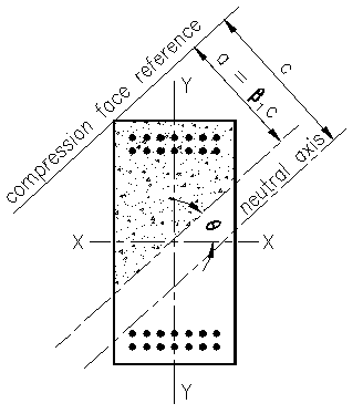 There are many occasions when it is necessary to analysis for strengths that include bending about both principle axes. If biaxial bending is present, then the result is a neutral axis that is not oriented with either principle axis. See Figure 3.3.2 for a typical example. The area of concrete included in Whitney's stress block is the shaded area, less the area of the included bars. It is necessary to compute the area, and centroid, of this region for any given value of location, c, and angle, q. The resulting force, Cc = 0.85f'cAc, will be centered on the center of this area. This resultant force is unlikely to fall on either principle axis, so it will cause moments about each principle axis. Similarly each bar will have its own unique distance, d, measured perpendicular to the compression face reference which will result in a unique strain, stress, and force value for each bar. The same equations presented earlier for computing strain, stress, and force are used. Each bar force will cause moments about both principle axis, unless it falls on one of the axes. Summary All of this can be quite daunting at first. There is no doubt that the computational effort can be quite large, however the basic principles of strain compatibility and equilibrium apply in every case. With the exception of singly reinforced rectangular cross sections, finding strengths involves a process that iteratively varys the location of the neutral axis, c, then computing the resulting concrete and steel strains, stresses, and forces. The resulting forces are then used to compute net axial force and moment about each principle axis. This process relies heavily on the ability to compute concrete areas and centroidal locations as well as determine distances to steel elements, both from the compression face and from the principle axes. Given that shapes and rebar patterns can be complex, the geometrical aspects of the computations can become quite challenging. The sheer number of elements in a cross section can add to the burdens associated with these computations. <<< Previous Section <<< >>> Next Section >>>