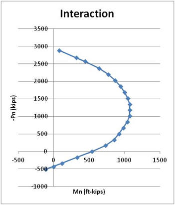 + TS3*|18"-33"| - Cc*|18"-11.7"| Note that, due to symmetry of areas and forces, all the forces computed are centered on the centroidal "Y" axis in this case. This means that none of the forces create moment about the centroidal "Y" axis and hence: Mny = 0.00 ft-k Part (a) Result: Pn = -1600 kips (compression), Part (b) A general spreadsheet for this problem has been created so that the nominal strengths can be determined for any location of neutral axis. Using the spreadsheet, solutions were found for a sufficient number of cases (i.e. locations of "c") to create an interaction curve for axial force and bending about the "X" axis. Table 3.6.1.1 lists the results and Figure 3.6.1.5 is the graph of the results.