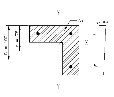 Solution: Part (a) For c=0", the entire section is considered to be in tension with the strain in the steel being beyond the steel strain. None of the concrete contributes to the strength. As all the bars are the same size, the force in each bar is the same: Ti = (60 ksi) x (1.27 in2) = 67.6 kips/bar Given that there are three bars: Pn = 3 x (67.6 kips) The associated nominal moments can be found by taking moments about each principle axis: Mnx = (67.6 k)(6" -13.2") + (67.6 k)(6" -13.2") +