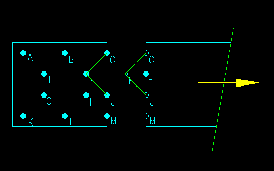 This is NOT A VALID PATH! Note that not all the bolts are "left behind" when the main part of the member is pulled away. All bolts except F are in the "left behind" part attached to the side plates and F is in the "torn away" part. Since the "torn away" part is also still attached to the side plates by bolt F, the only way that this fracture can occur is if the side plates also fracture at the same path... not a possible or likely event!