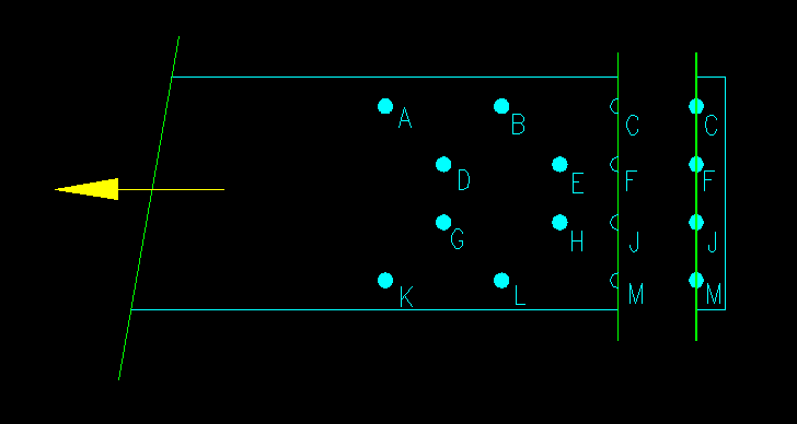 This is NOT A VALID PATH! Note that not all the bolts are "left behind" when the main part of the member is pulled away. Bolts A, B, D, E, G, H, K and L are in the "torn away" part and the rest are in the "left behind" part that is attached to the main plate. Since the "torn away" part is also still attached to the main plate, the only way that this fracture can occur is if the main plate also fractures at the same path... not a possible or likely event!