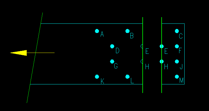 This is NOT A VALID PATH! Note that not all the bolts are "left behind" when the main part of the member is pulled away. Bolts A, B, D, G, K and L are in the "torn away" part and the rest are in the "left behind" part that is attached to the main plate. Since the "torn away" part is also still attached to the main plate, the only way that this fracture can occur is if the main plate also fractures at the same path... not a possible or likely event!