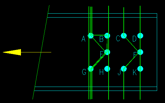 Figure FP-2c show an FBD of the end of one of the splice plates with the same failure paths considered for the W section. Again there are more potential failure paths than shown, but the given set includes the valid failure path(s).