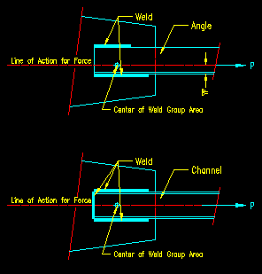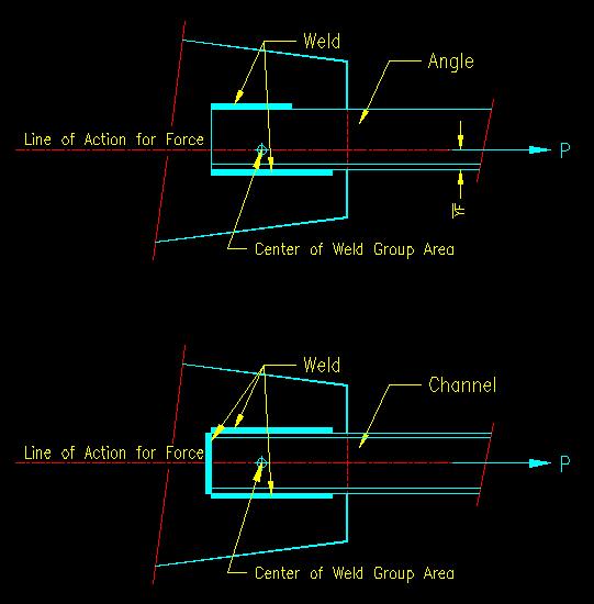 Section 5.2 Finding Forces on Welds Last Revised: 07/08/2023 Now that you know a little about welds and what they do, let's look at ways in which we can determine the force on a part of a weld in a connection. The methods and procedures commonly used for finding forces resulting from applied forces are presented below. Note that these methods and procedures result from principles of structural mechanics and structural analysis and are NOT found in the specification. As far as the specification is concerned, it is the engineer's responsibility to find the forces in welds by any defendable method. It is common to express the results of weld force calculations in terms of the force per unit length of weld. In connections where there is eccentricity, the stress varies throughout the weld group. The force per unit length is found by multiplying the stress (force per unit area) at a given location by the effective throat (or weld thickness), te, at that location. Connections with Concentric Forces
