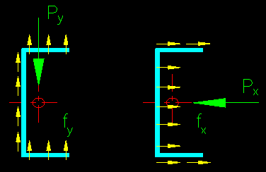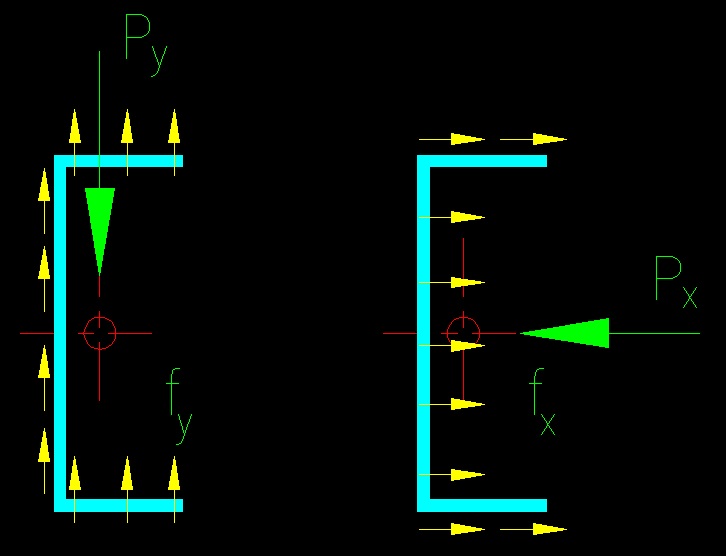 * ri) - Pn ro The above equilibrium equations are useful in finding the proper IC. Since all the radial distances and angles are functions of the location of the IC, coordinate values of the IC are iteratively selected until equilibrium is satisfied (i.e., when all the equilibrium equations yield the same Pn). This procedure is well suited to a spreadsheet using an optimization routine such as the “solver” found in MS Excel. The resulting Pn is the nominal capacity of the weld group. The AISC Coefficient Method Similar to the method provided for bolts which was discussed in BGSCM 4.3, AISC has solved the IC method for many situations and has provided tables with the resulting coefficients. These begin on SCM pg 8-71. These extensive tables do not begin to cover all possible cases so there will be times when you need to compute your own coefficients. Take some time to look at SCM Tables 8-4 through 8-11 to see how to determine C for a given situation. Note that there are tables for a wide variety of weld configurations and load scenarios, however they do no cover every situation and it is frequently necessary to interpolate between published values or even resort to solving the IC problem on your own. You will need to examine the variables in each table to see how they are applied. There is some variation from table to table. Generally, you will need to compute values of 'k' and 'a' to use the tables. For a given weld configuration, you know the values for 'kl' and 'al' ('kl' is the distance between welds or the length of a leg as defined on the appropriate sketch and 'al' is the eccentricity distance ex as defined on the appropriate sketch). k = (kl)/l a = (ex)/l = (al)/l The conditions given on SCM pages 8-71 through 8-76 are unique in that they can also be used for out-of-plane eccentricity by setting k equal to zero. This is a very common situation--particularly for beam connection tabs. As we have seen, C relates the force in a weld to the overall force on the connection. The use of these tables is self-explanatory. Spend some time reviewing them. The Plastic Method On SCM page 8-17 a method known as the Plastic Method is presented to deal with a special case of out-of-plane eccentricity. The method deals with the very common special case of a pair linear welds subject to an out-of-plane eccentric load (Table 8-4 for the k=0 case, if using the AISC coefficient method). The revised method in the 16th edition is an improvement over the procedure originally presented in the 15th edition. In this method the required weld size is determined using weld geometry and loading. SCM equations 8-23 are used to determine the weld size. The equations are dependent on a the term Nequiv. Two approaches are presented for determining the term Nequiv used in the weld size determination: the Conventional Plastic Method (CPM), and the Optimum Plastic Method (OPM). The CPM is the simpler of the two methods and is considered to be more conservative. Neither of the methods are computationally complex. In the CPM, the full length of the weld is used to resist the bending and normal forces, as shown in SCM Figure 8-9(a). For the CPM, the equation for Nequiv is given in SCM Equation 8-27a. The equation is quite simple. The OPM can only be used when the normal force, Nr, is not zero. The assumed stress distribution is more complex than that used in the CPM and equations 8-27b and 8-28 are provided to compute Nequiv. The procedure appears to be set up for 70 ksi electrodes. It may be possible to use the coefficients found in SCM Table 8-3 to adapt to other electrode strengths, however this is not mentioned in presentation of the Plastic method. Eccentricity Normal to the Plane of the Faying Surface The SCM presents an elastic method for determining the stresses in welds when the eccentricity is normal to the plane of the faying surface (see SCM page 8-12). The SCM discussion is pretty sparse but adequate. The basic approach is an elastic vector approach where the force is moved to be concentric with the weld group and a moment added account for the bending resulting from eccentricity. Figure 5.2.6 illustrates the condition. Figure 5.2.6 The basis of the method is founded in principles of elastic mechanics. Use is made of the principle of equivalent forces and basic concepts of stress. The force is moved so that it passes through the center of the weld group at the faying surface and the corresponding moment (Pe) is applied about the neutral axis of the weld group. The forces are considered to be resisted by the weld group without taking into consideration any contribution from the compression between the connected parts. The stresses are computed using basic principles of mechanics. The translational stresses are shown in Figure 5.2.7. Figure 5.2.7 The stresses are computed using the equations: fx = Px / Aw Where: