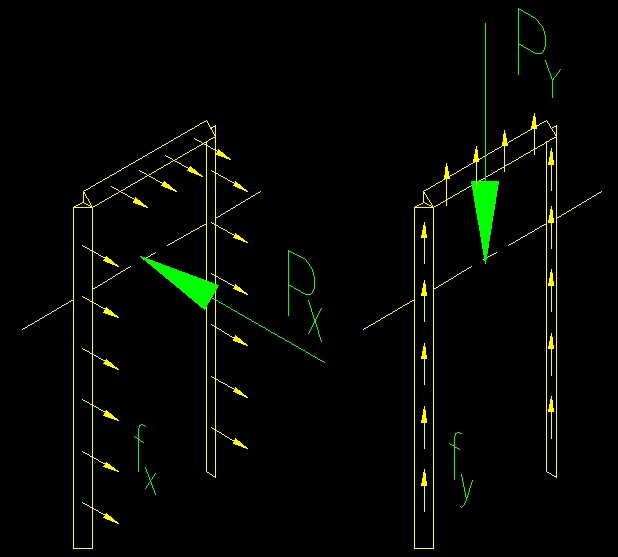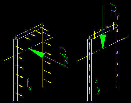 Figure 5.2.1 illustrates two connections where the applied force, P, is concentric with the fillet weld group. In each case, the stress at any location equals the concentric force, P, divided by the area of the welds (sum of tel for all weld segments). Note that, for fillet welds, we do not differentiate between tensile and shear force. In a fillet weld all stresses are assumed to be shear as they will have a significant shearing component on the critical face of the weld. An important assumption when determining the shear in welds WHERE THE APPLIED CONNECTION FORCE IS CONCENTRIC WITH THE WELD GROUP is that all shear planes in a connection see the same applied shear STRESS, fv. This is an appropriate assumption because all welds are constrained by the connected members to deform the same. If they all have the same shear deformations, then they all have the same shear strains and hence they all have the same shear stress. The shear stress, fv, on the critical shear planes equals the total force being transferred divided by sum of all the shear plane areas: fv = P / S(Shear Plane Areas) = P / S(te * lengths) The UNIT SHEAR FORCE = fv te (units are force per unit length of weld) In Plane Eccentrically Loaded Connections As with bolts, there is an elastic method based on basic principles of superposition and there is an ultimate strength method that looks at the simultaneous translation and rotation of the connection. Additional, new with the 15th edition and continued in the 16th edition, is a plastic method. All three are found in the welding section of the SCM (part 8, pages 8-13 to 8-19). Figure 5.2.2 depicts a typical case of an eccentrically loaded weld group, with the load in the plane of the faying surface. Figure 5.2.2 The Elastic Method The Elastic method is described in the SCM starting on page 8-15. Using the principle of superposition, the applied forces are converted to a concentric (i.e., passes through the center of the weld group) translational force and a rotational moment. The stress due to the translational force is equal to the applied force divided by total length of the weld and effective throat, te. See SCM page 8-15 for the equations. The direction of the reactionary stress is opposite that of the applied force. It is common practice to break the force into orthogonal components (i.e., in the "x" and "y" directions, as shown in Figure 5.2.3) and combine the stresses vectorally with the stress resulting from the moment. Figure 5.2.3 Note that the orientation of the weld with relation to the direction of the applied force is not of concern. All the stresses are assumed to be shear stresses. The stress due to the applied moment is determined using the torsion formula learned in Mechanics. The equation can be found on SCM page 8-15. Figure 5.2.4 shows the applied force and the reactionary stresses. Note that the stress at any location is perpendicular to a line from that same location that passes through the center of gravity of the bolt group. Figure 5.2.4 Computing the stress due to the applied moments requires that the polar moment of inertia be computed for the weld group. SCM page 8-16 gives some equations for Ix and Iy for some common weld shapes. Using the parallel axis theorem, these equations can be combined to find Ix and Iy for the group relative to the weld group centroid. With this information Ip can be computed since Ip = Ix + Iy. From the given equations the stresses at any point in the weld group can be determined by vectorally adding the translational and rotational components for the stresses at the point of interest. SCM page 8-15 provides general equations for determining the two orthogonal components of the rotational reaction and how to vectorally add the components together. As stated above, the goal is to find the largest stress, fv, in the weld group. The maximum stress can then be expressed as a unit shear force: The UNIT SHEAR FORCE = fv te The Instantaneous Center of Rotation (aka Ultimate Strength) Method