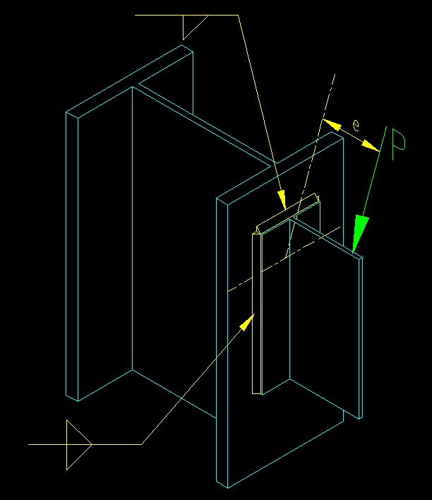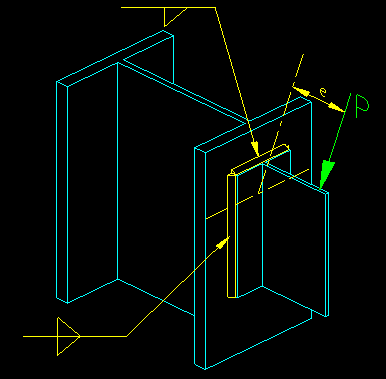 Multiplying fmax by te gives the maximum unit force applied to the weld group. The resulting unit force is then compared to the capacity (frn or rn/W, depending on whether P was Pu or Pa). An example of a connection with an out-of-plane eccentricity is shown in Figure 5.2.9. Figure 5.2.9 |