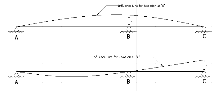 Figure 3: Influence Lines for Reaction at "B" and "C" The influence line for reaction at “B” shows, if the movable load is a uniform load, that the load should be placed on both spans. It also shows that there is no location where load can be placed on the beam that will cause a downward reaction at “B”. The influence line for reaction at “C” shows that an upward reaction at “C” is found by loading the right span and that loading the left span will result in a downward reaction. Three unique load diagrams for a uniformly distributed load are derived from the influence lines, as shown in Figure 4.