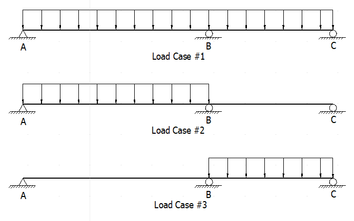 Figure 4: Unique Uniformly Distributed Load Cases for Reactions Load Case #1 will provide the maximum upward reaction at “B” Load Case #2 will provide the maximum upward reaction at "A” and the maximum downward reaction at "C” Load Case #3 will provide the maximum downward reaction at "A” and the maximum upward reaction at "C”. The reactions at each of the three points are determined using these loading diagrams with the appropriate distributed load magnitude. The resulting reactions from each load case can, due to linear elastic behavior, be combined by superposition with reactions due to other non-movable loads on the span to arrive at the total reaction at each point. |